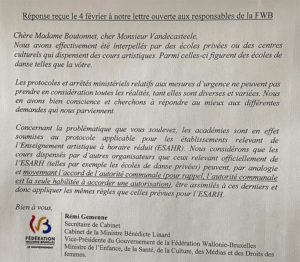 Nous avons reçu un mail du cabinet du Ministre Bénédicte Linard (Culture) nous autorisant à suivre le protocole suivi par les académies de danse publiques (ci-dessous).